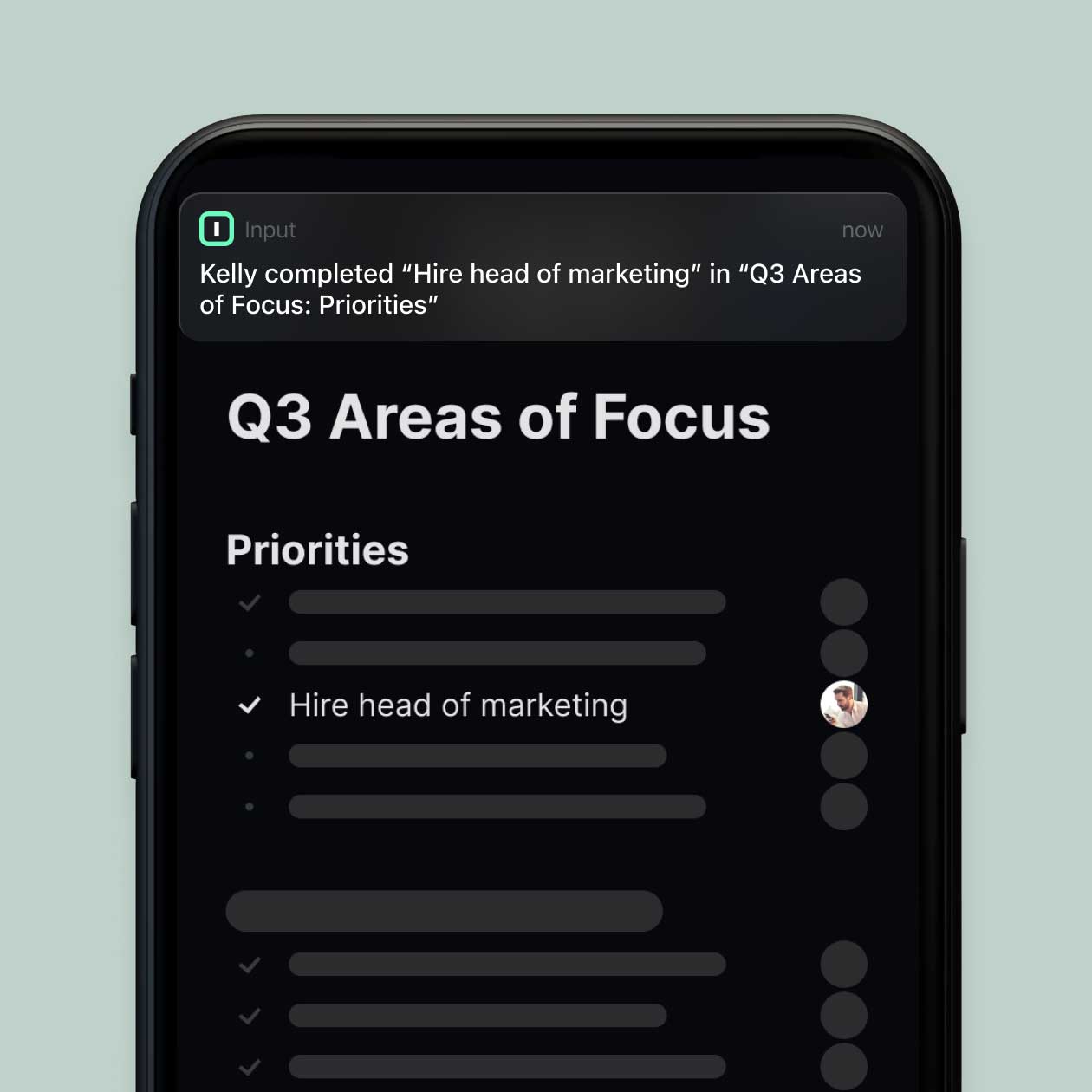 Checking off a task just isn't enough. Input builds transparency by acting as a repository of your team's most important conversations. Instantly reference why a decision was made, so you can ditch awkward follow-up emails and status update requests.